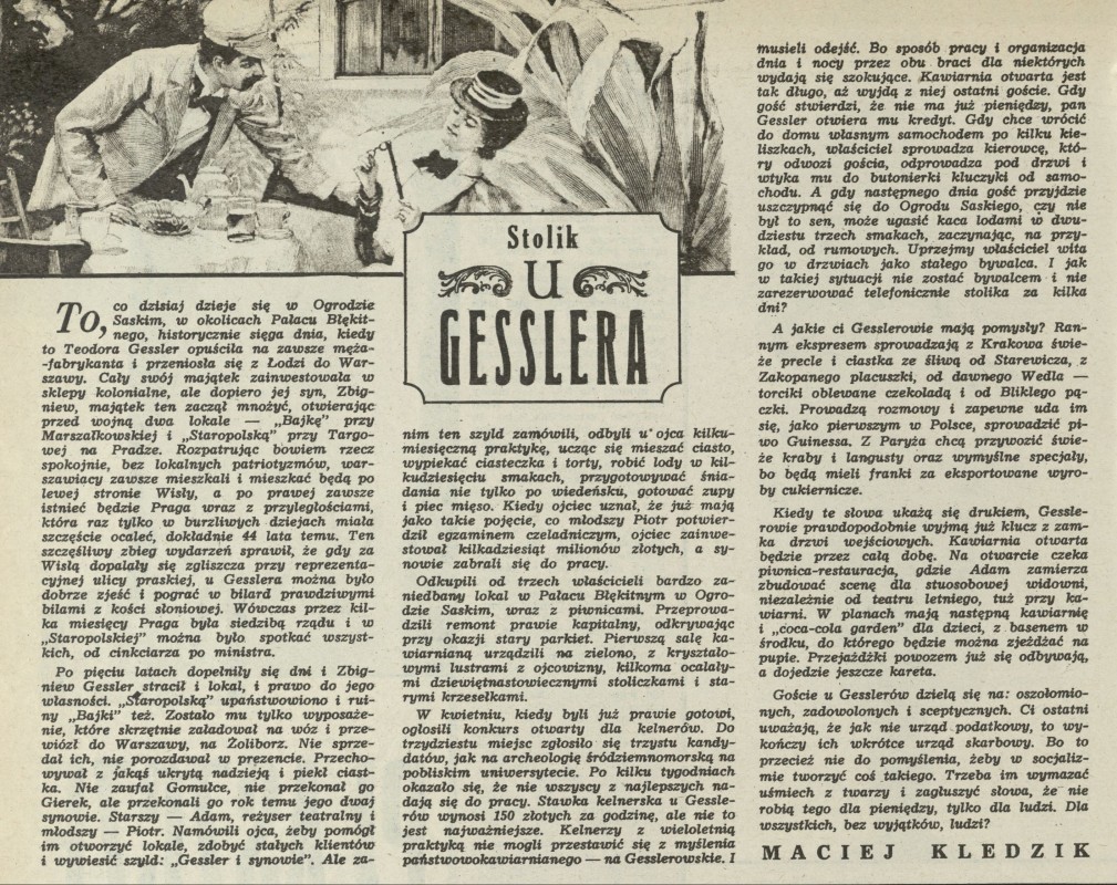 Archiwum / Różności nr 2261 (41/1988) 25/59 Podziel się Tytuł Stolik u Gesslera Autor Maciej Kledzik Kategoria Różności Artykuł z numeru 2261 (41/1988) Data wydania 9 października 1988 Tagi Gessler Teodora Ogród Saski