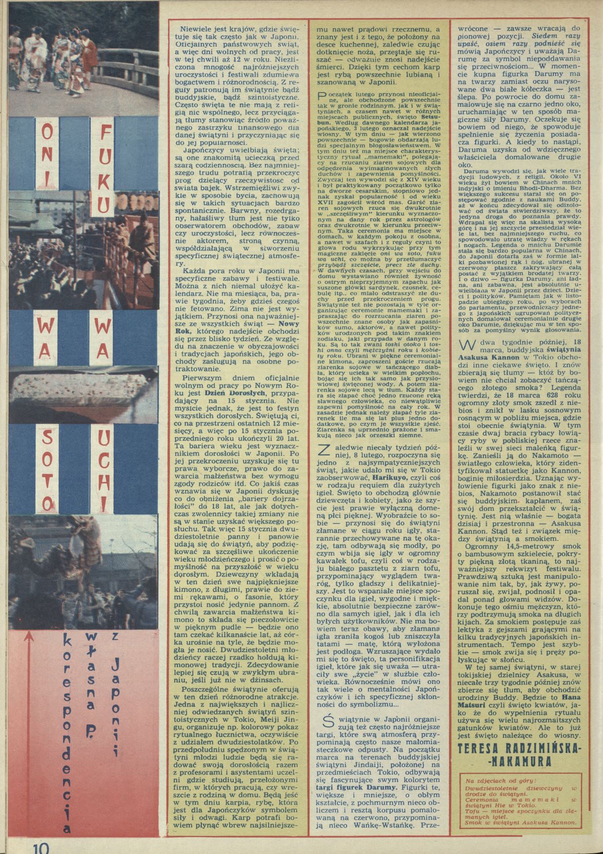 Archiwum / korespondencja własna "Przekroju" nr 1666 (11/1977) 69804/123969 Podziel się Tytuł Oni wa soto fuku wa uchi Autor Teresa Radzimińska-Nakamura Rubryka korespondencja własna "Przekroju" Artykuł z numeru 1666 (11/1977) Data wydania 13 marca 1977 Tagi Japonia Tokio japońskie święta Ceremonia Mame Maki ceremonia rzucania fasolą Daruma
