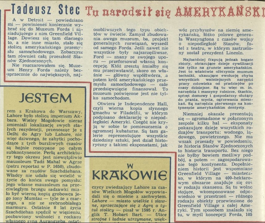 Archiwum / korespondencja własna "Przekroju" nr 1683 (28/1977) 475/626 Podziel się Tytuł Tu narodził się amerykański samochód Autor Tadeusz Stec Rubryka korespondencja własna "Przekroju" Artykuł z numeru 1683 (28/1977) Data wydania 10 lipca 1977 Tagi Ameryka podróż motoryzacja