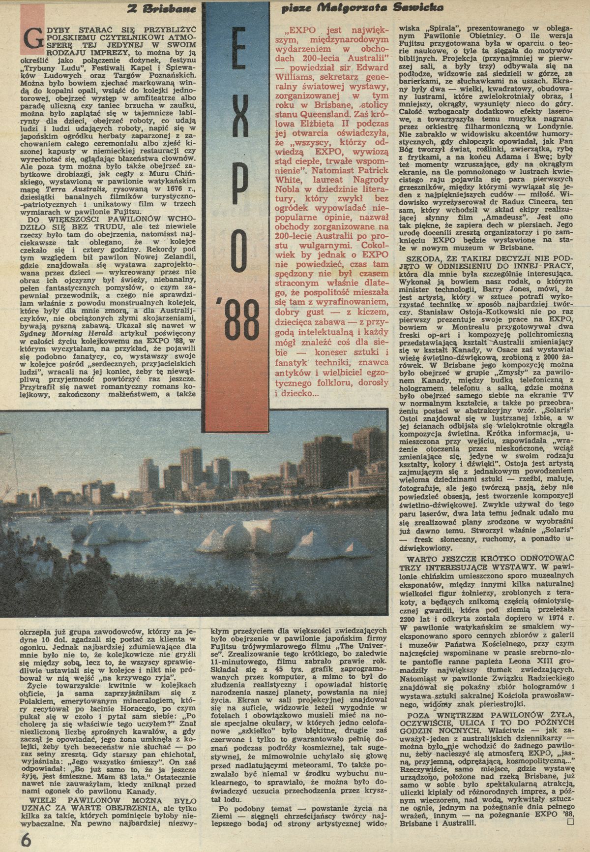 Archiwum / korespondencja własna "Przekroju" nr 2262 (42/1988) 49/85 Podziel się Tytuł Expo'88 Autor Małgorzata Sawicka Rubryka korespondencja własna "Przekroju" Artykuł z numeru 2262 (42/1988) Data wydania 16 października 1988 Tagi Brisbane EXPO Queensland 200-lecie Australii