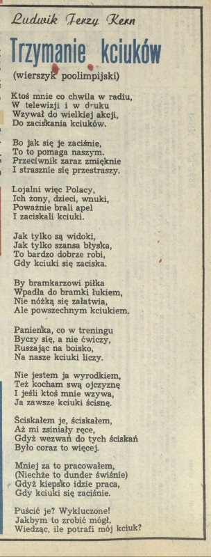 Archiwum / Rozmaitości [old] nr 2262 (42/1988) 45/54 Podziel się Tytuł Trzymanie kciuków Autor Ludwik Jerzy Kern Rubryka Rozmaitości [old] Artykuł z numeru 2262 (42/1988) Data wydania 16 października 1988 Tagi Ludwik Jerzy Kern poezja