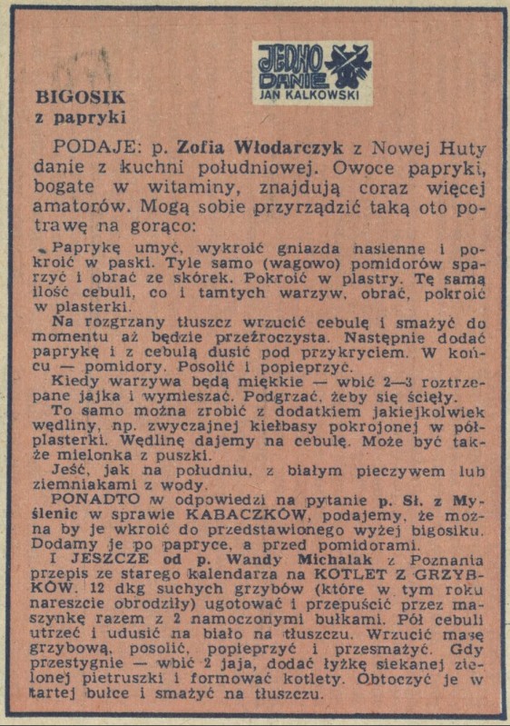 Archiwum / Jedno danie nr 1694 (39/1977) 71047/123969 Podziel się Tytuł Bigosik z papryki Autor Jan Kalkowski Rubryka Jedno danie Artykuł z numeru 1694 (39/1977) Data wydania 25 września 1977