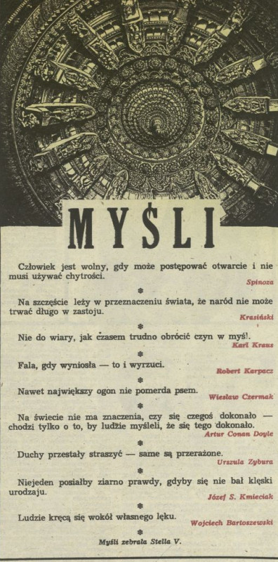 Archiwum / Myśli nr 2265 (45/1988) 93134/123969 Podziel się Tytuł Myśli Autor Stella Varcaby Rubryka Myśli Artykuł z numeru 2265 (45/1988) Data wydania 6 listopada 1988 Tagi cytaty myśli aforyzmy