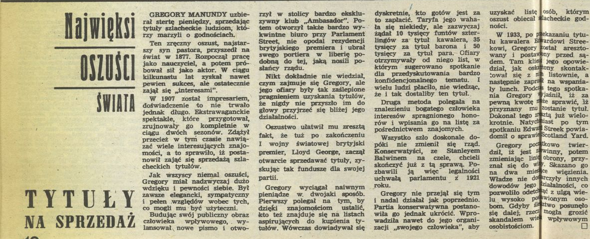 Archiwum / Różności nr 2265 (45/1988) 1/1 Podziel się Tytuł Najwięksi oszuści świata: Tytuły na sprzedaż Kategoria Różności Artykuł z numeru 2265 (45/1988) Data wydania 6 listopada 1988 Tagi Gregory Manundy Ambasador