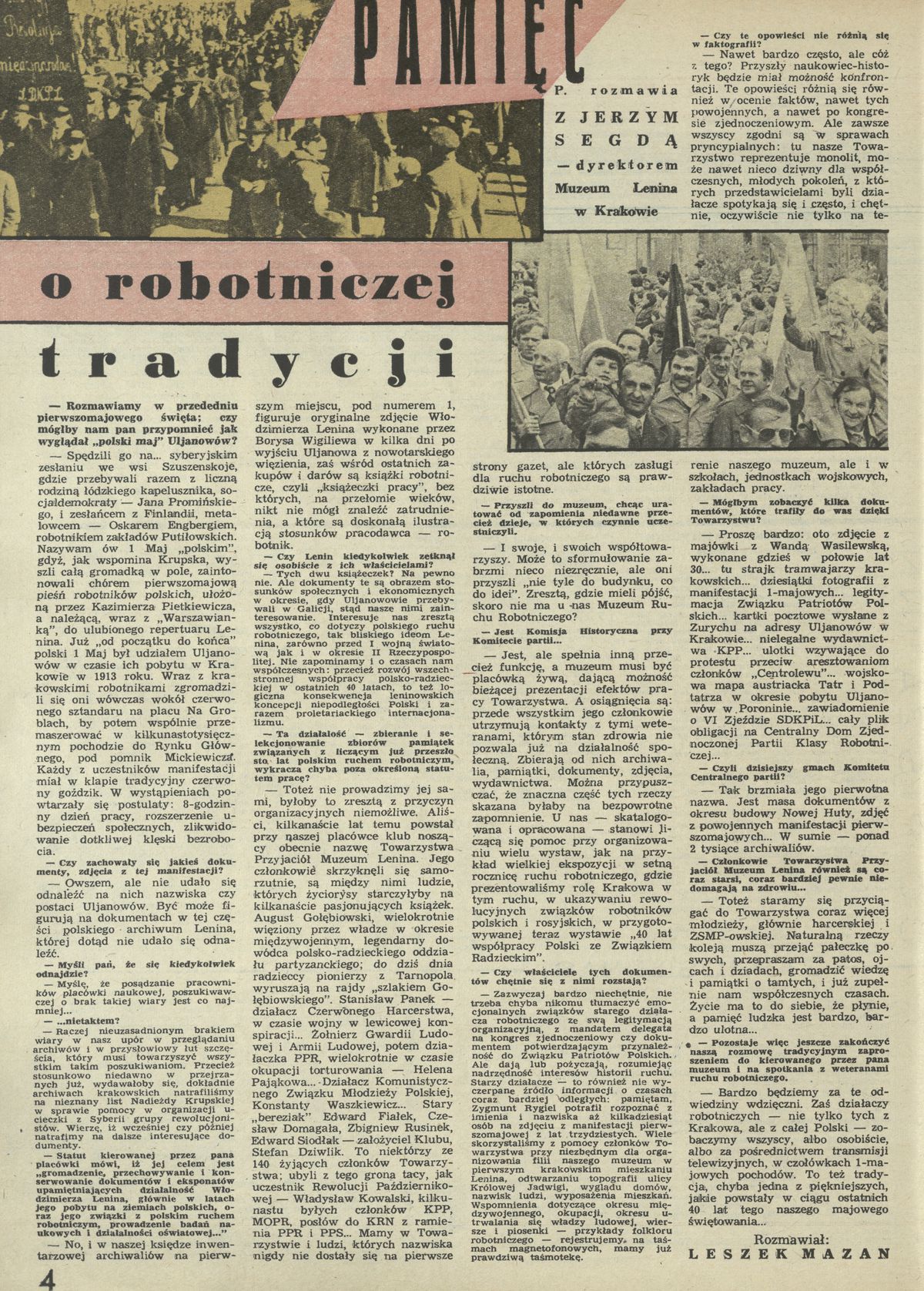 Archiwum / Rozmowy „Przekroju” nr 2029 (18/1984) 83410/123969 Podziel się Tytuł Pamięć o robotniczej tradycji Autor Leszek Mazan Rubryka Rozmowy „Przekroju” Artykuł z numeru 2029 (18/1984) Data wydania 29 kwietnia 1984