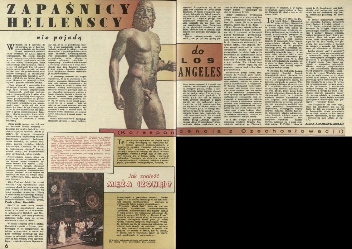 Archiwum / korespondencja własna "Przekroju" nr 2030 (19/1984) 05/14 Podziel się Tytuł Zapaśnicy helleńscy nie pojadą do Los Angeles Autor Alina Adamczyk-Aiello Rubryka korespondencja własna "Przekroju" Artykuł z numeru 2030 (19/1984) Data wydania 6 maja 1984 Tagi Letnie Igrzyska Olimpijskie 1984