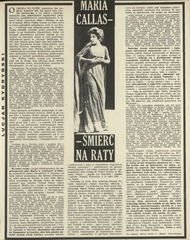 Archiwum / Kultura nr 1696 (41/1977) 71119/123969 Podziel się Tytuł Maria Callas - śmierć na raty Autor Lucjan Kydryński Kategoria Kultura Artykuł z numeru 1696 (41/1977) Data wydania 9 października 1977