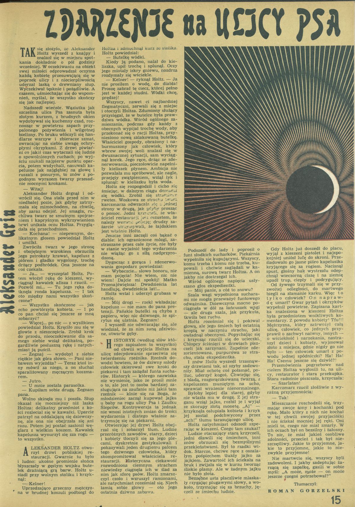 Archiwum / Proza nr 1696 (41/1977) 7/9 Podziel się Tytuł Zdarzenie na ulicy psa Autor Aleksander Gria Kategoria Proza Artykuł z numeru 1696 (41/1977) Data wydania 9 października 1977