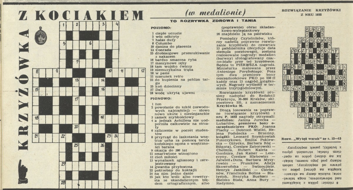 Archiwum / Krzyżówka z kociakiem nr 1696 (41/1977) 39/49 Podziel się Tytuł Krzyżówka z kociakiem Rubryka Krzyżówka z kociakiem Artykuł z numeru 1696 (41/1977) Data wydania 9 października 1977