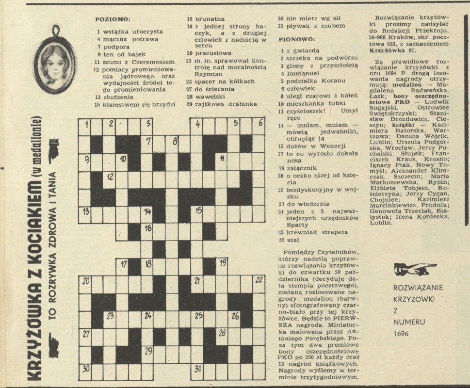 Archiwum / Krzyżówka z kociakiem nr 1697 (42/1977) 40/49 Podziel się Tytuł Krzyżówka z kociakiem Rubryka Krzyżówka z kociakiem Artykuł z numeru 1697 (42/1977) Data wydania 16 października 1977