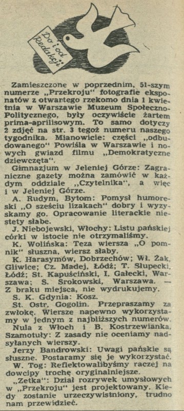 Archiwum / Listy do i od redakcji nr 52 (14/1946) 1287/123969 Podziel się Tytuł Do i od redakcji Rubryka Listy do i od redakcji Artykuł z numeru 52 (14/1946) Data wydania 7 kwietnia 1946