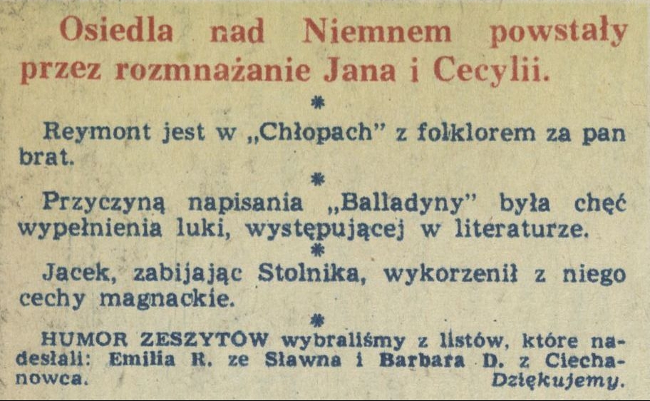 Archiwum / Humor zeszytów szkolnych nr 1704 (49/1977) 18652/23034 Podziel się Tytuł Humor zeszytów szkolnych Rubryka Humor zeszytów szkolnych Artykuł z numeru 1704 (49/1977) Data wydania 4 grudnia 1977