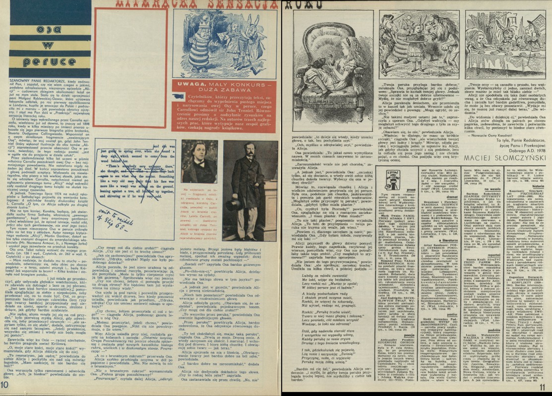 Archiwum / Proza nr 1713 (06/1978) 03/11 Podziel się Tytuł Osa w peruce Autor Maciej Słomczyński Kategoria Proza Artykuł z numeru 1713 (6/1978) Data wydania 5 lutego 1978 Tagi "Alicja w Krainie Czarów" Lewis Carroll