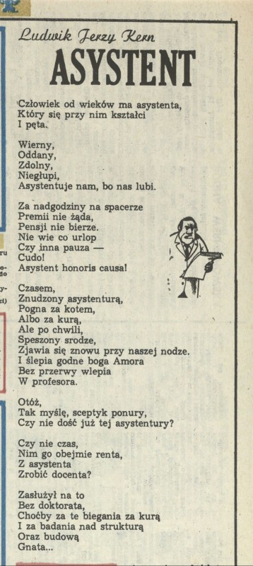 Archiwum / Rozmaitości [old] nr 2270 (50/1988) 84/89 Podziel się Tytuł Asystent Autor Ludwik Jerzy Kern Rubryka Rozmaitości [old] Artykuł z numeru 2270 (50/1988) Data wydania 4 grudnia 1988 Tagi Ludwik Jerzy Kern poezja