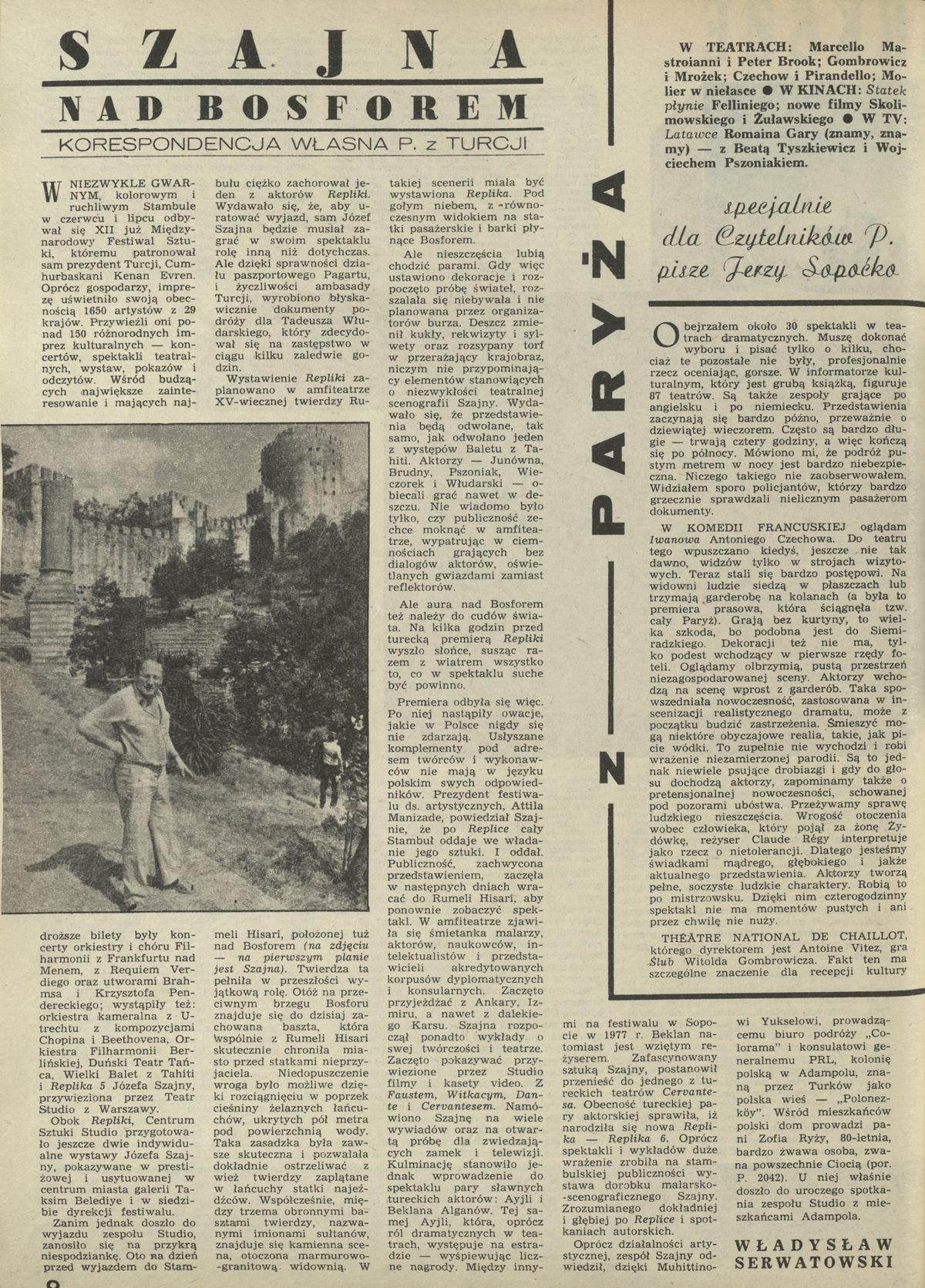 Archiwum / korespondencja własna "Przekroju" nr 2044 (33/1984) 84015/123969 Podziel się Tytuł Szajna nad Bosforem Autor Władysław Serwatowski Rubryka korespondencja własna "Przekroju" Artykuł z numeru 2044 (33/1984) Data wydania 12 sierpnia 1984