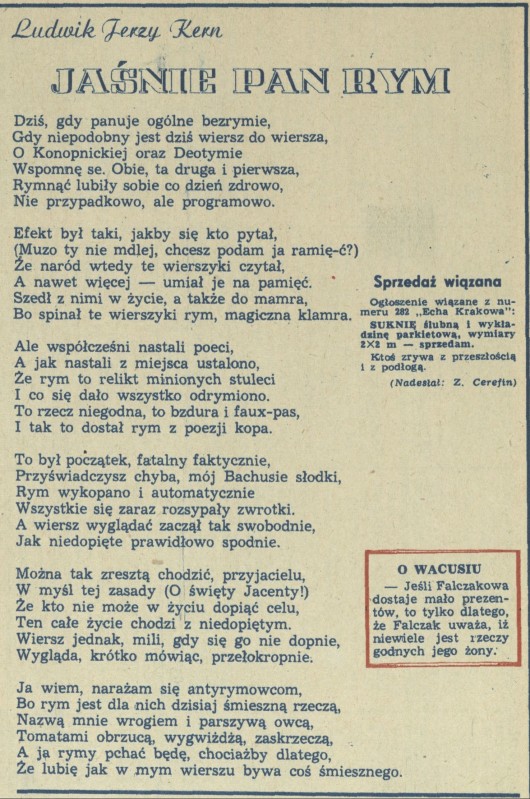 Archiwum / Rozmaitości [old] nr 1712 (05/1978) 10/71 Podziel się Tytuł Jaśnie pan rym Autor Ludwik Jerzy Kern Rubryka Rozmaitości [old] Artykuł z numeru 1712 (5/1978) Data wydania 29 stycznia 1978 Tagi wiersz poezja