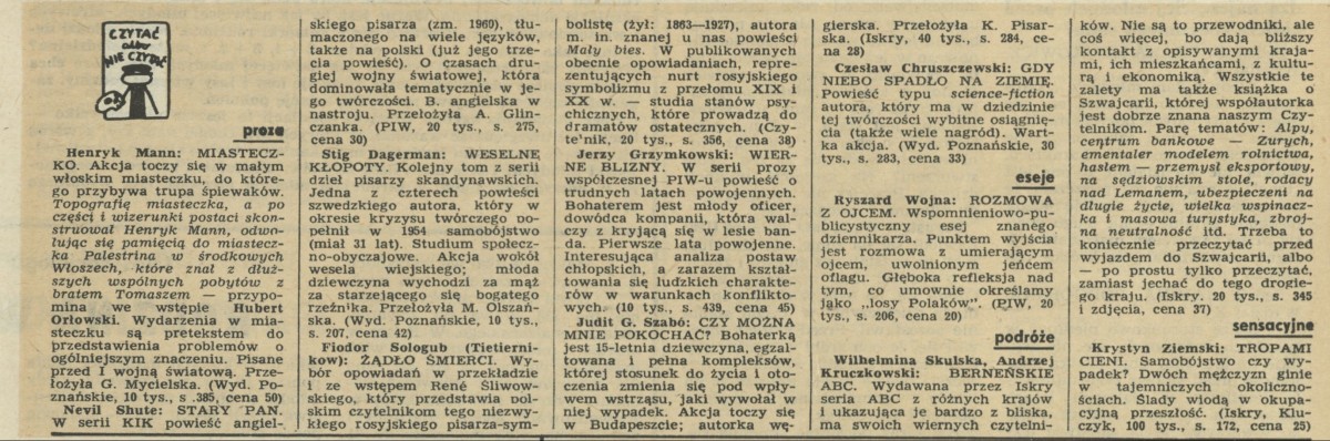 Archiwum / Czytać albo nie czytać? nr 1733 (26/1978) 72695/123969 Podziel się Tytuł Czytać, albo nie czytać Rubryka Czytać albo nie czytać? Artykuł z numeru 1733 (26/1978) Data wydania 25 czerwca 1978
