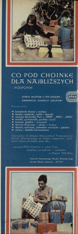 Archiwum / Reklamy nr 1706-7 (51-52/1977) 11/105 Podziel się Tytuł Co pod choinkę dla najbliższych Rubryka Reklamy Artykuł z numeru 1706-7 (51/1977) Data wydania 18 grudnia 1977