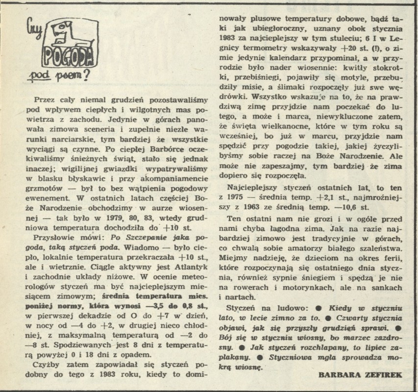 Archiwum / Czy pogoda pod psem? nr 2274 (02/1989) 93536/123969 Podziel się Tytuł Czy pogoda pod psem? Autor Barbara Zefirek Rubryka Czy pogoda pod psem? Artykuł z numeru 2274 (2/1989) Data wydania 8 stycznia 1989 Tagi prognoza pogody
