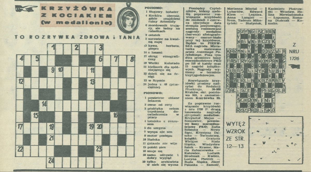 Archiwum / Krzyżówka z kociakiem nr 1729 (22/1978) 72541/123969 Podziel się Tytuł Krzyżówka z kociakiem Rubryka Krzyżówka z kociakiem Artykuł z numeru 1729 (22/1978) Data wydania 28 maja 1978