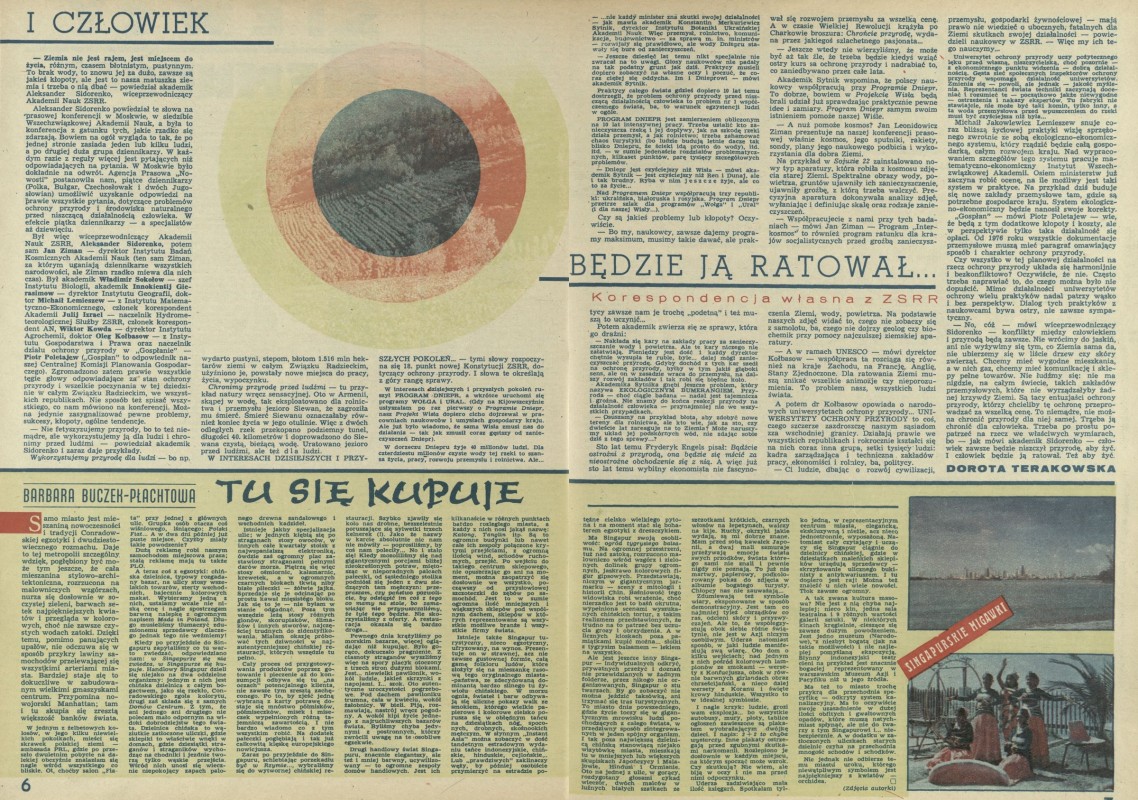 Archiwum / korespondencja własna "Przekroju" nr 1749 (42/1978) 58/74 Podziel się Tytuł I człowiek będzie ją ratował Autor Dorota Terakowska Rubryka korespondencja własna "Przekroju" Artykuł z numeru 1749 (42/1978) Data wydania 15 października 1978 Tagi ZSRR