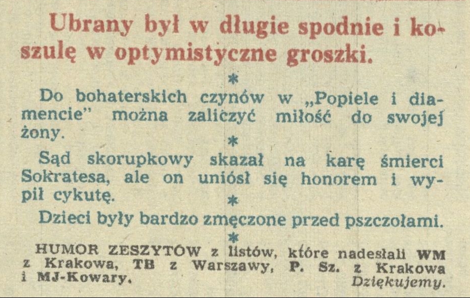 Archiwum / Humor zeszytów szkolnych nr 2037 (26/1984) 784/1474 Podziel się Tytuł Humor zeszytów Rubryka Humor zeszytów szkolnych Artykuł z numeru 2037 (26/1984) Data wydania 24 czerwca 1984 Tagi humor zeszyt
