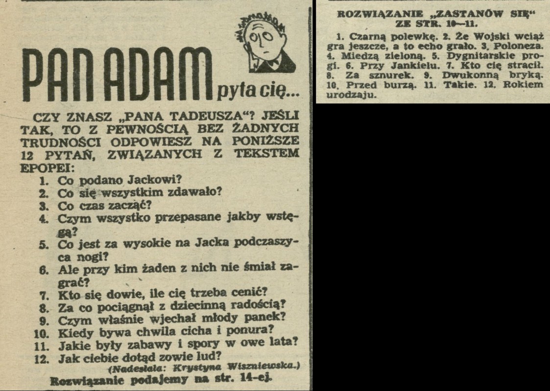Archiwum / Zastanów się nr 353 (02/1952) 33/1907 Podziel się Tytuł Pan Adam pyta cię... Rubryka Zastanów się Artykuł z numeru 353 (2/1952) Data wydania 13 stycznia 1952 Tagi Pan Tadeusz
