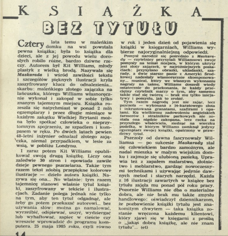 Archiwum / Kultura nr 2039 (28/1984) 1/2 Podziel się Tytuł Książka bez tytułu Autor et Kategoria Kultura Artykuł z numeru 2039 (28/1984) Data wydania 8 lipca 1984 Tagi ksiązka Maskarada