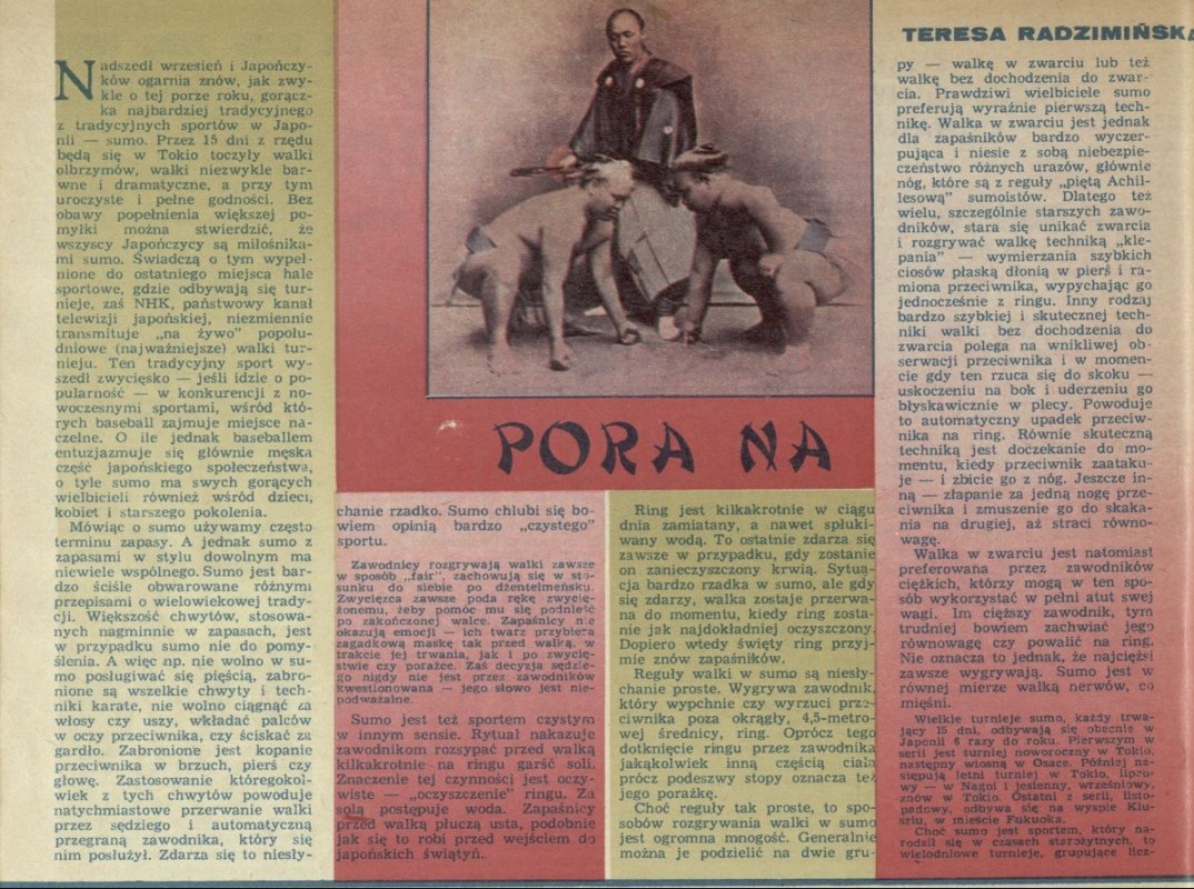 Archiwum / Artykuł nr 1692 (37/1977) 345/405 Podziel się Tytuł Pora na ... sumo Autor Teresa Radzimińska-Namakura Kategoria Artykuł Artykuł z numeru 1692 (37/1977) Data wydania 11 września 1997 Tagi sumo Japonia zwyczaje