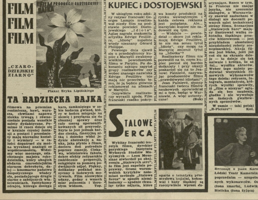 Archiwum / Film nr 164 (22/1948) 1/1 Podziel się Tytuł Film Film Film Rubryka Film Artykuł z numeru 164 (22/1948) Data wydania 30 maja 1948 Tagi Czarodziejska bajka Stalowe serca