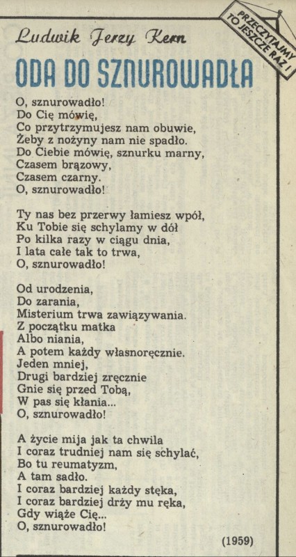 Archiwum / Rozmaitości [old] nr 2046 (35/1984) 3/3 Podziel się Tytuł Oda do sznurowadła Autor Ludwik Jerzy Kern Rubryka Rozmaitości [old] Artykuł z numeru 2046 (35/1984) Data wydania 26 sierpnia 1984