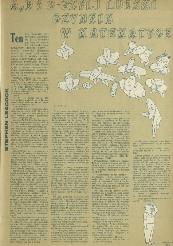 Archiwum / Opowiadanie nr 1692 (37/1977) 1328/1341 Podziel się Tytuł A, B i C - czyli ludzki czynnik w matematyce Kategoria Opowiadanie Artykuł z numeru 1692 (37/1977) Data wydania 11 września 1997 Tagi logika zagadka
