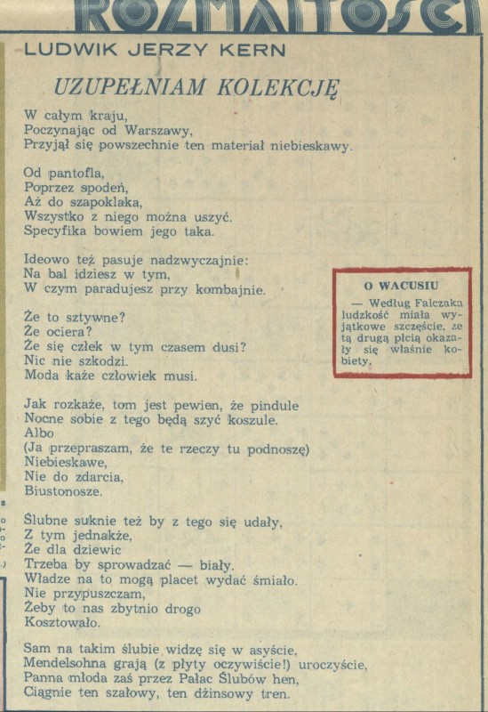 Archiwum / Rozmaitości [old] nr 1692 (37/1977) 64/2248 Podziel się Tytuł Uzupełniam kolekcję Autor Ludwik Jerzy Kern Rubryka Rozmaitości [old] Artykuł z numeru 1692 (37/1977) Data wydania 11 września 1997 Tagi humor wiersz