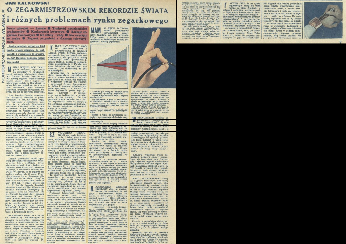 Archiwum / korespondencja własna "Przekroju" nr 1761 (01/1979) 65/65 Podziel się Tytuł O zegarmistrzowskim rekordzie świata i różnych problemach rynku zegarkowego Autor Jan Kalkowski Rubryka korespondencja własna "Przekroju" Artykuł z numeru 1761 (1/1979) Data wydania 7 stycznia 1979 Tagi zegarmistrzostwo Szwajcarja zegarki