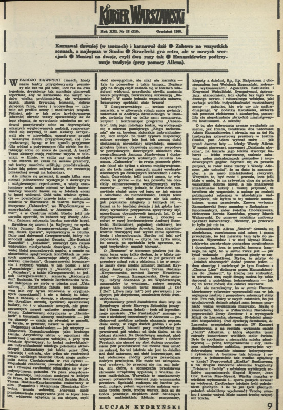 Archiwum / Kurier Warszawski nr 2275 (03/1989) 93565/123969 Podziel się Tytuł Kurier Warszawski Autor Lucjan Kydryński Rubryka Kurier Warszawski Artykuł z numeru 2275 (3/1989) Data wydania 15 stycznia 1989 Tagi Studio Strzelcki Hanuszkiewicz Woody Allen teatr