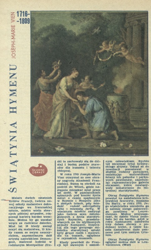 Archiwum / Sławne obrazy nr 1762 (02/1979) 15/360 Podziel się Tytuł Joseph-Marie Vien - Świątynia Hymenu Autor Wer. Rubryka Sławne obrazy Artykuł z numeru 1762 (2/1979) Data wydania 14 stycznia 1979 Tagi malarstwo francuskie