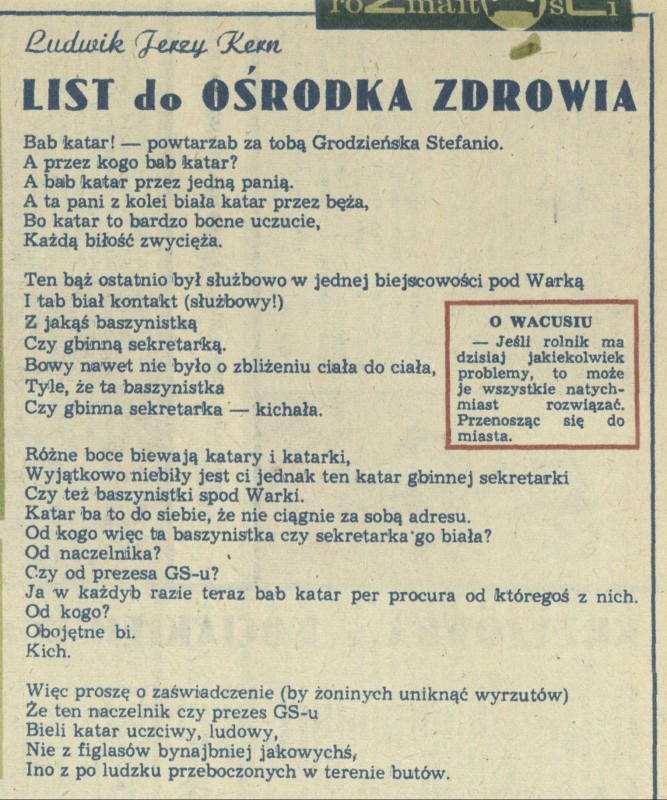 Archiwum / Rozmaitości [old] nr 1762 (02/1979) 24/239 Podziel się Tytuł Listy do Ośrodka Zdrowia Autor Ludwik Jerzy Kern Rubryka Rozmaitości [old] Artykuł z numeru 1762 (2/1979) Data wydania 14 stycznia 1979 Tagi wiersz katar