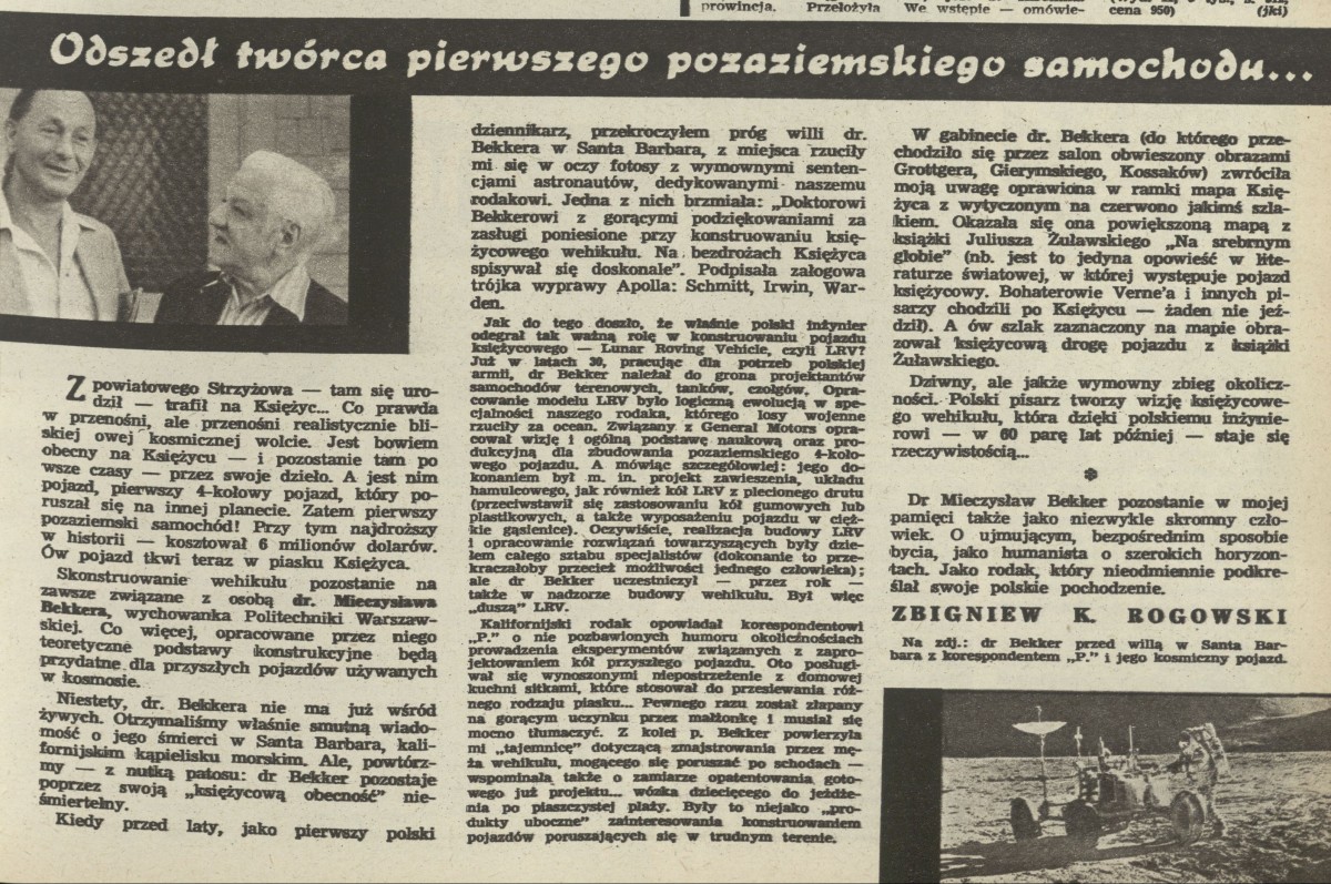 Archiwum / Relacja nr 2277 (05/1989) 4/4 Podziel się Tytuł Odszedł twórca pierwszego pozaziemskiego samochodu... Autor Zbigniew K. Rogowski Kategoria Relacja Artykuł z numeru 2277 (5/1989) Data wydania 29 stycznia 1989 Tagi Mieczysław Beller Politechnika Warszawska księżyc