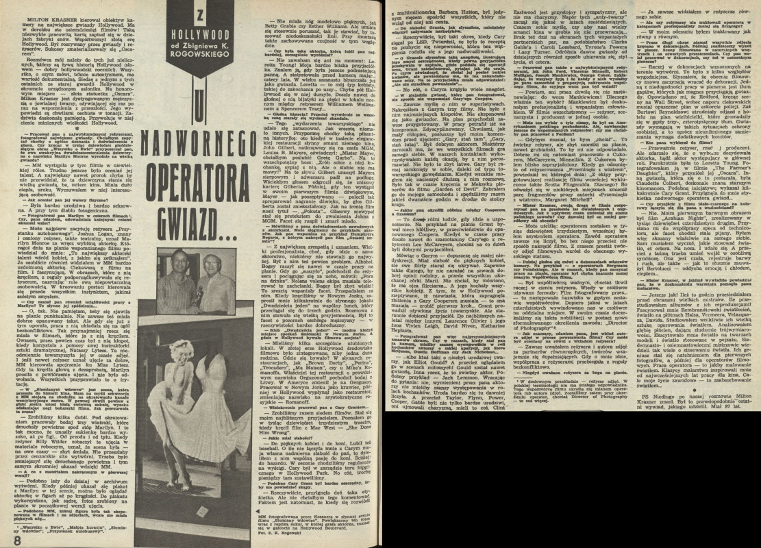 Archiwum / korespondencja własna "Przekroju" nr 2278 (06/1989) 17/186 Podziel się Tytuł U nadwornego operatora gwiazd... Autor Zbigniew K. Rogowski Rubryka korespondencja własna "Przekroju" Artykuł z numeru 2278 (6/1989) Data wydania 5 lutego 1989 Tagi Hollywood Marilyn Monroe Milton Krasner