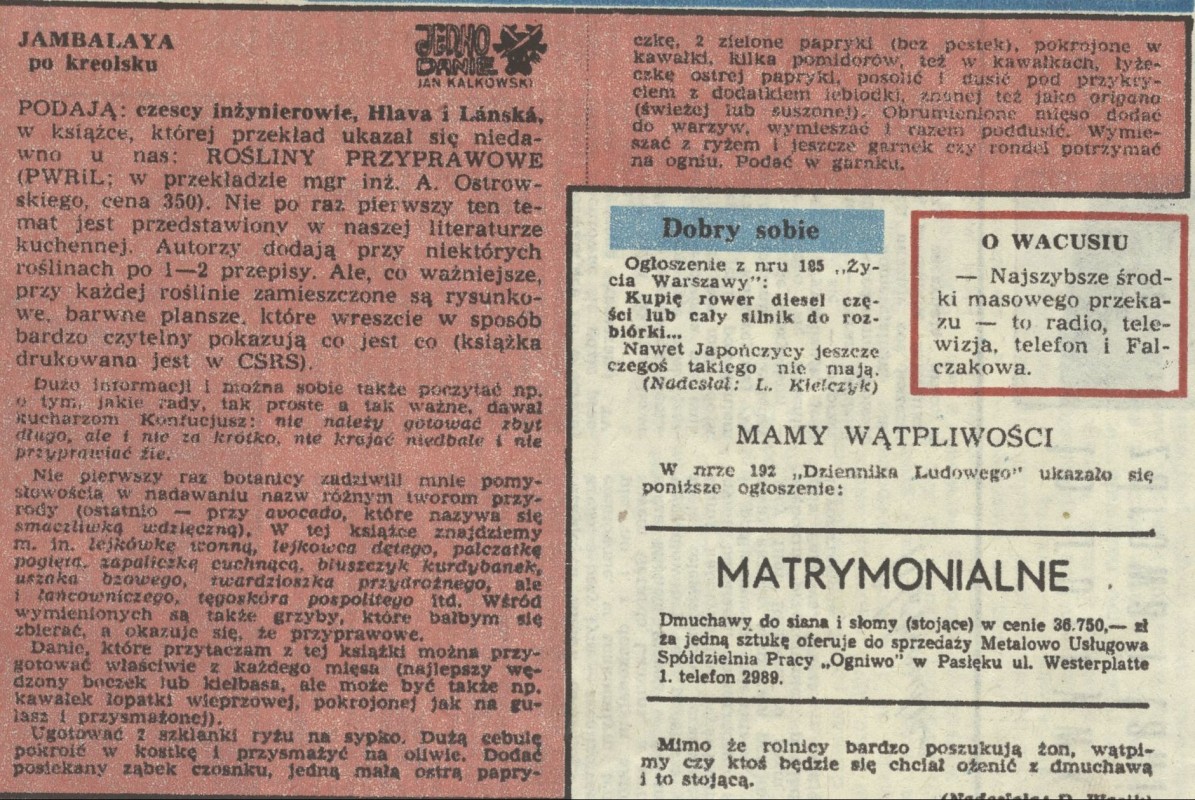 Archiwum / Jedno danie nr 2047 (36/1984) 84172/123969 Podziel się Tytuł Jedno danie Autor Jan Kalkowski Rubryka Jedno danie Artykuł z numeru 2047 (36/1984) Data wydania 2 września 1984 Tagi jambalaya