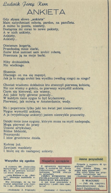Archiwum / Ankieta nr 1756 (49/1978) 04/51 Podziel się Tytuł Ankieta Autor Ludwik Jerzy Kern Rubryka Ankieta Artykuł z numeru 1756 (49/1978) Data wydania 3 grudnia 1978