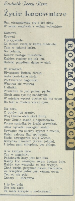 Archiwum / Poezja nr 1778 (18/1979) 735/2007 Podziel się Tytuł Życie kocownicze Autor Ludwik Jerzy Kern Kategoria Poezja Artykuł z numeru 1778 (18/1979) Data wydania 6 maja 1979