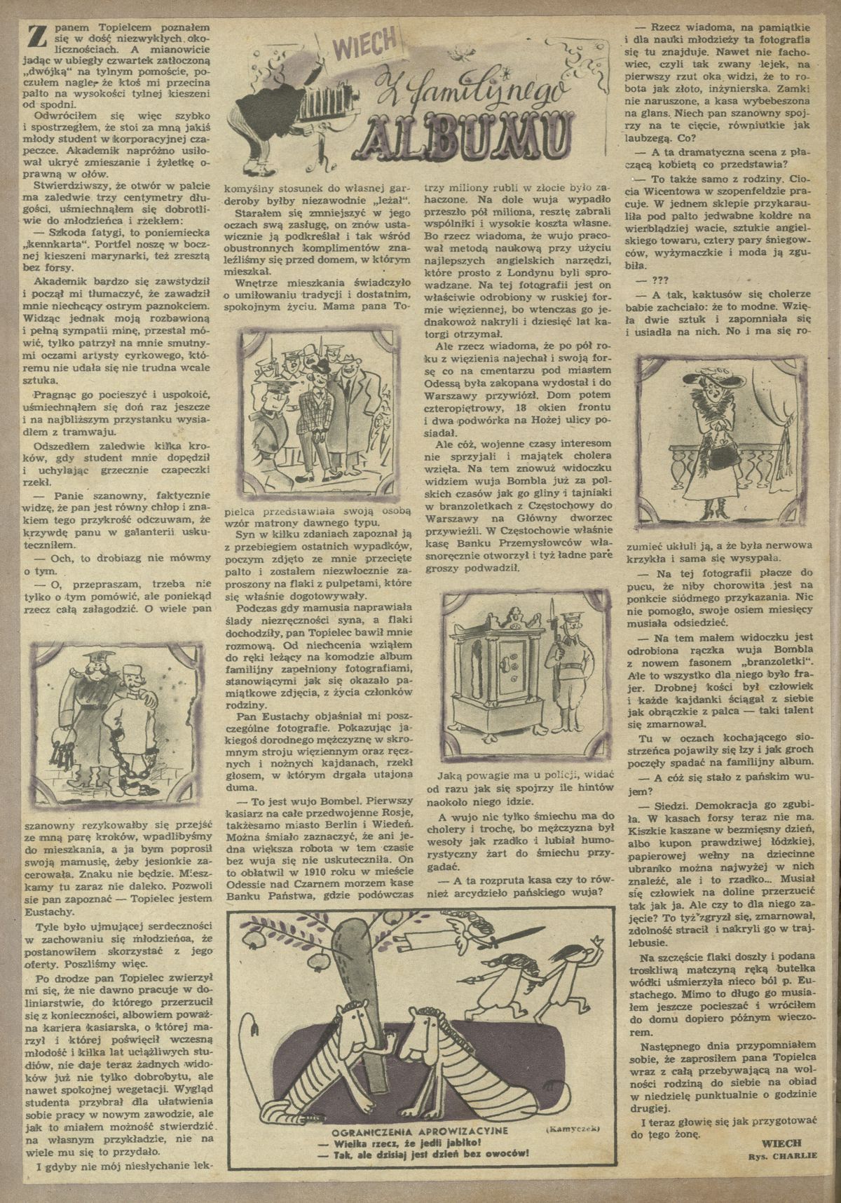 Archiwum / Opowiadanie nr 55 (17/1946) 07/465 Podziel się Tytuł Z familijnego albumu Autor Wiech Karol "Charlie" Ferster Kategoria Opowiadanie Artykuł z numeru 55 (17/1946) Data wydania 28 kwietnia 1946 Tagi Charlie