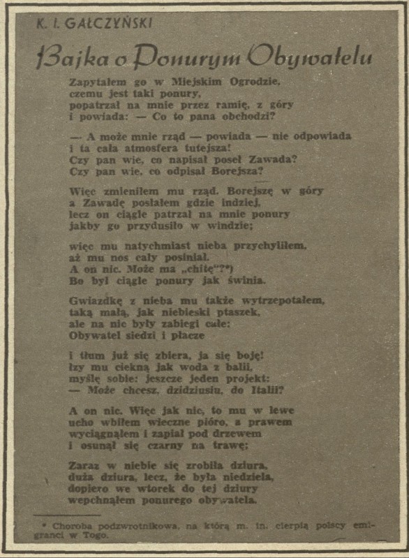 Archiwum / Poezja nr 60 (22/1946) 10/74 Podziel się Tytuł Bajka o Ponurym Obywatelu Autor Konstanty Ildefons Gałczyński Kategoria Poezja Artykuł z numeru 60 (22/1946) Data wydania 2 czerwca 1946