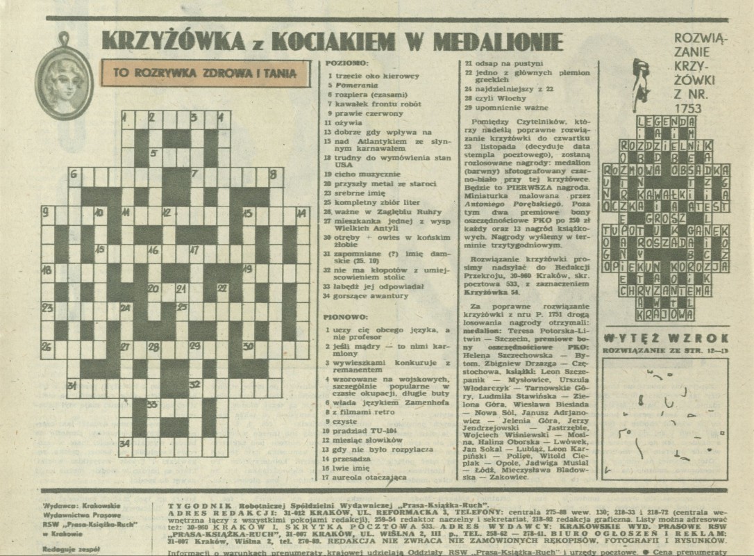 Archiwum / Krzyżówka z kociakiem nr 1754 (47/1978) 345/393 Podziel się Tytuł Krzyżówka z kociakiem Rubryka Krzyżówka z kociakiem Artykuł z numeru 1754 (47/1978) Data wydania 19 listopada 1978 Tagi krzyżówka różności