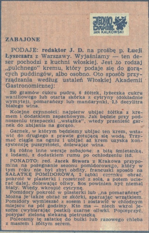 Archiwum / Jedno danie nr 1754 (47/1978) 06/52 Podziel się Tytuł Zabajone Autor Jan Kalkowski Rubryka Jedno danie Artykuł z numeru 1754 (47/1978) Data wydania 19 listopada 1978 Tagi przepisy kuchenne