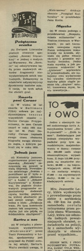 Archiwum / Mieszanka firmowa nr 563 (04/1956) 05/43 Podziel się Tytuł Mieszanka firmowa Rubryka Mieszanka firmowa Artykuł z numeru 563 (4/1956) Data wydania 22 stycznia 1956 Tagi Związek Literatów Dorothy Caruso jazz "Neapol miasto milionerów" Teatr Ateneum