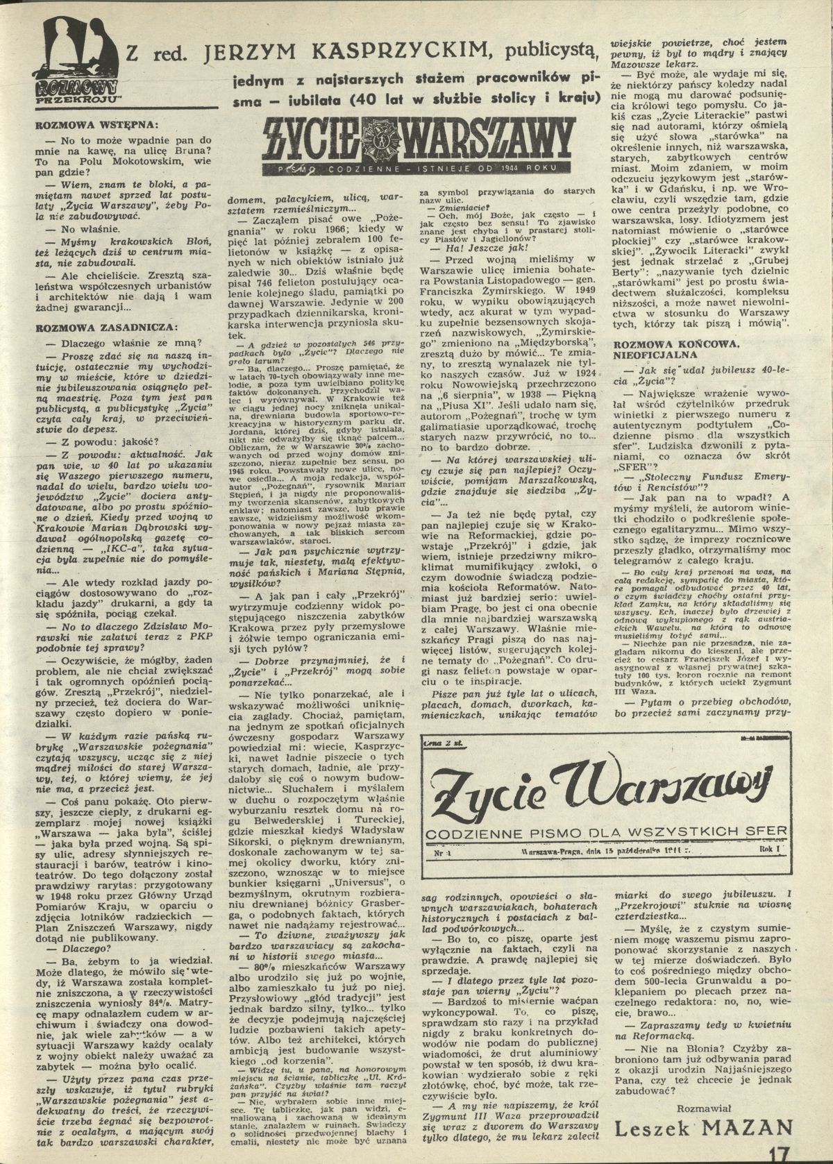 Archiwum / Rozmowy „Przekroju” nr 2055 (44/1984) 84475/123969 Podziel się Tytuł Życie Warszawy Autor Leszek Mazan Rubryka Rozmowy „Przekroju” Artykuł z numeru 2055 (44/1984) Data wydania 28 października 1984