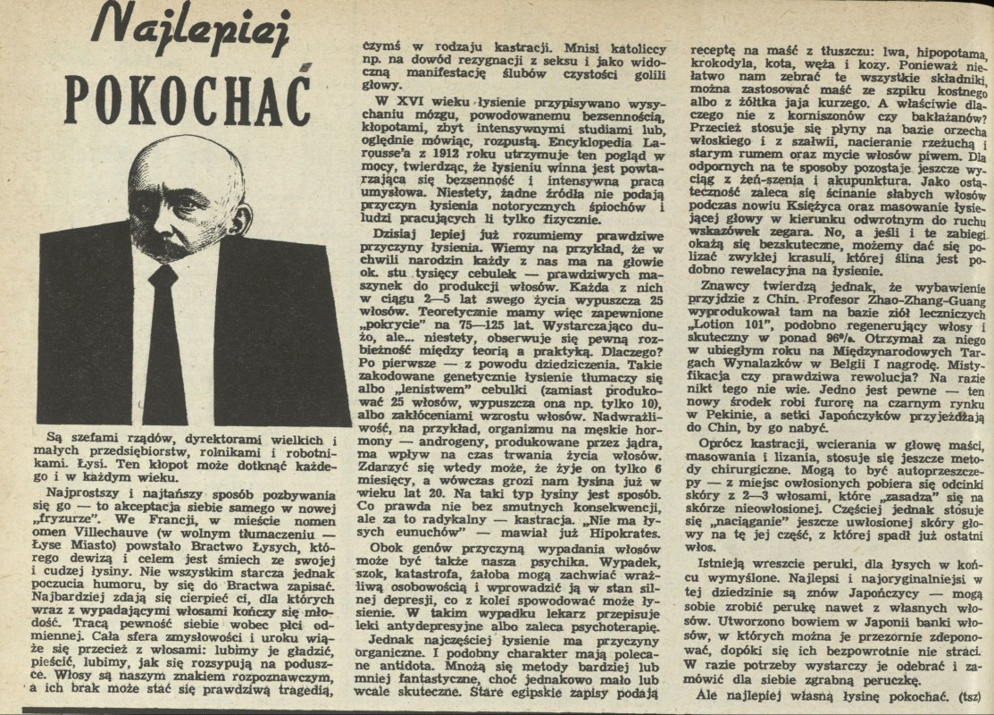 Archiwum / Artykuł nr 2283 (11/1989) 3/3 Podziel się Tytuł Najlepiej pokochać Autor tsz Kategoria Artykuł Artykuł z numeru 2283 (11/1989) Data wydania 12 marca 1989 Tagi łysina zdrowie włosy