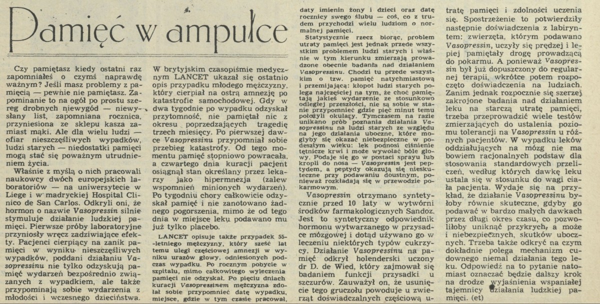 Archiwum / Nauka nr 1752 (45/1978) 73528/123969 Podziel się Tytuł Pamięć w ampułce Autor et Kategoria Nauka Artykuł z numeru 1752 (45/1978) Data wydania 5 listopada 1978 Tagi zanik pamięci Lancet Vasopressin lek medycyna de Wied